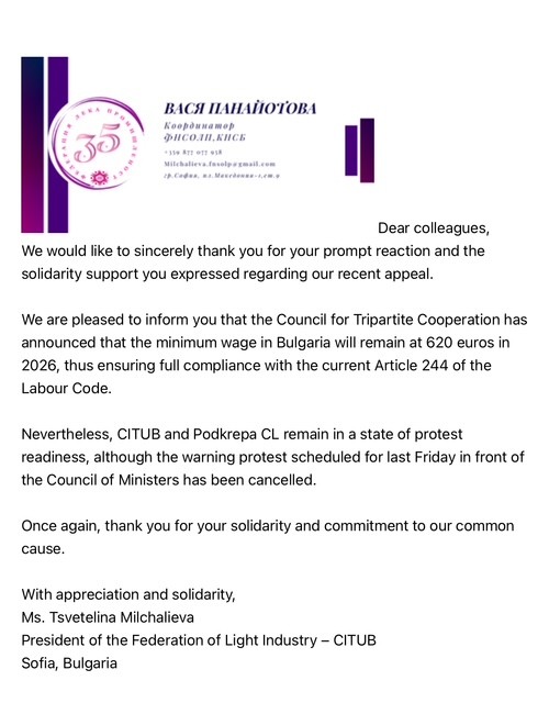 SOFIA: We are pleased with today’s letter from our colleagues in Bulgaria. We are especially happy about their success, as together we have managed to defend an attack on fundamental workers’ rights — to have a decent wage for fairly performed work.